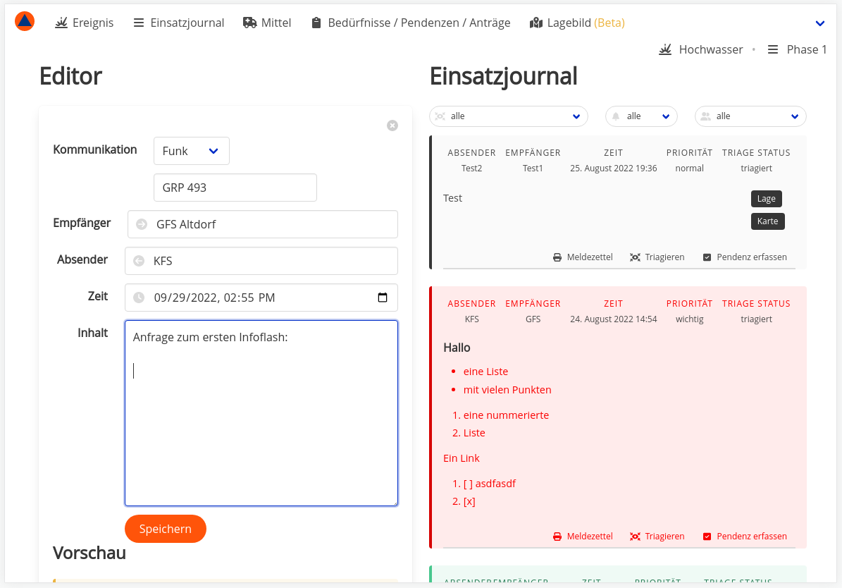 Samtliche Nachrichten sind chronologisch im Einsatzjournal erfasst und bieten eine guten Überblick über die aktuelle Lage.